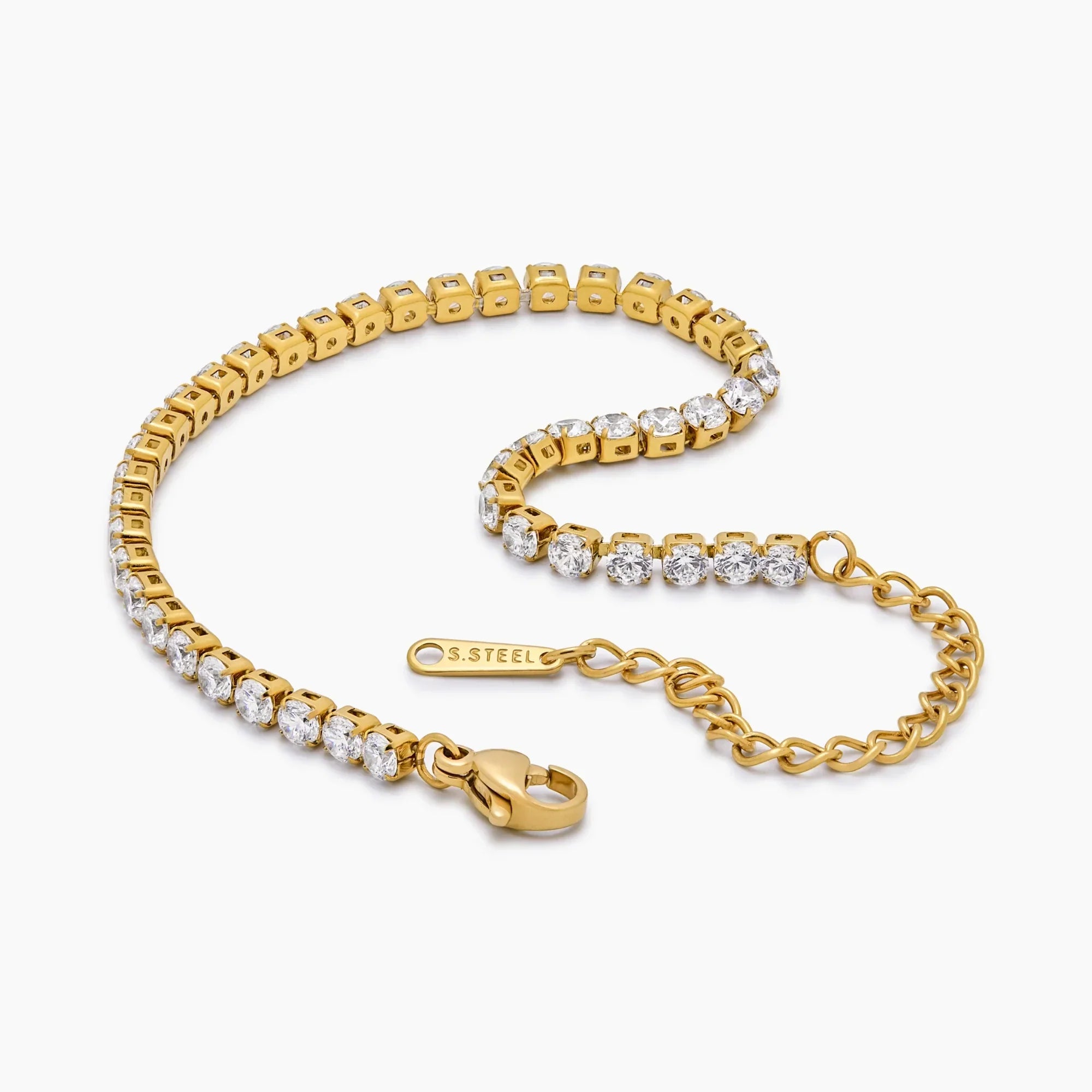 This bracelet features a perfect line of shimmering stones, each set in warm gold to create a classic and timeless look. Every sparkle catches the light, adding a quiet touch of elegance to any moment. Whether worn alone or layered, it’s a piece that feels both effortless and special. A reminder that beauty often lies in the simplest details.
